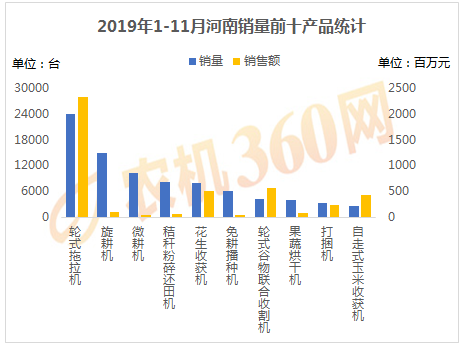 2019年1-11月,上榜河南用戶購機(jī)量前十的農(nóng)機(jī)產(chǎn)品如下圖所示,輪式拖拉機(jī)、旋耕機(jī)、微耕機(jī)等10種農(nóng)機(jī)合計購買力接近8.5萬臺,占了河南農(nóng)機(jī)總銷量的約80%,對這10類農(nóng)機(jī)的購機(jī)支出達(dá)43.3億元。