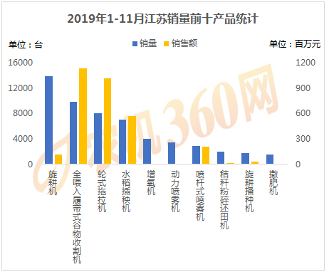 2019年1-11月,上榜江蘇用戶購機(jī)量前十的農(nóng)機(jī)產(chǎn)品如下圖所示,旋耕機(jī)、全喂入履帶式谷物收、輪式拖拉機(jī)等10種農(nóng)機(jī)合計購買力5.45萬臺,是江蘇農(nóng)機(jī)銷量的85.35%,對這10類農(nóng)機(jī)的購機(jī)支出達(dá)31.02億元。